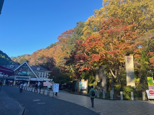 駅周辺は紅葉の絶景スポットで、特にケーブルカーの線路に沿った木々が鮮やかに色づきます。